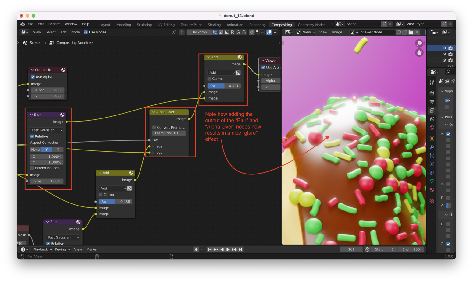 We can get the effect of colors “bleeding” in brightly lit areas by adding another “Blur” node.